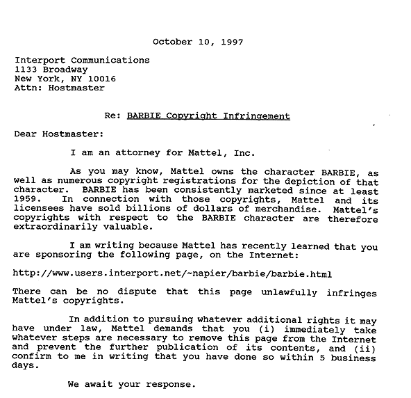 ...Interport is in a position of potential liability... We hope that you would appreciate our position and, as such, voluntarily remove the Web page from the Internet until the issue is resolved between Mattel, Inc. and yourself. Interport must have the Web page removed as of Wednesday 22 October 1997.On October 17, I received the following letter from the lawyer for Mattel, forwarded to me by Interport: